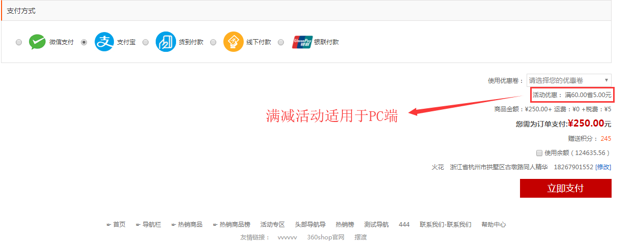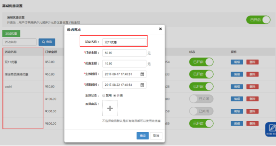 營銷 -> 優惠營銷:增加“滿減活動”,可以設置多個優惠條件,當訂單滿足多個優惠條件時候,選擇高金額的優惠條件。