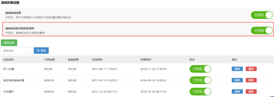 操作步驟: 總部后臺→營銷→優惠營銷→滿減優惠:在活動列表加總設置“滿減活動是否能用優惠券”,默認開啟。