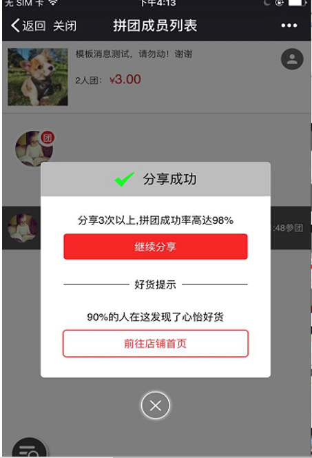 ① 點擊拼團詳情頁,最新訂單彈窗提醒顯示拼團訂單
