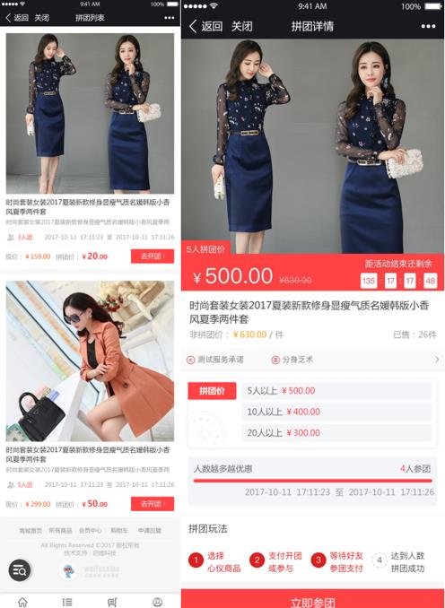 小團:邀請才可成為團友,邀請人為團長,滿足人數才可開團。為了避免團長開團后長期不能成團,開團24小時后如果還未成團,將會自動關閉訂單。小團可以設置團長是否免單,選擇允許,那團長下單時支付0元就參團成功。小團也可以在活動詳情頁面參與別人的團(針對小團,只會顯示與該團相關的最早的2個團,拼團成功后就不會顯示了)。