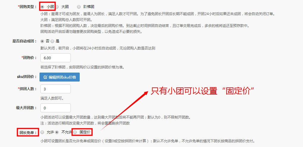 小團可以設置團長價(固定價),設置0或空按拼團價來計算。供應商后臺與總部后臺拼團規則相同