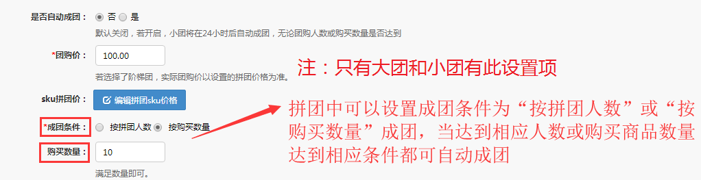 拼團活動可以設置是按“拼團人數”還是按“購買數量”來判斷是否達成成團條件