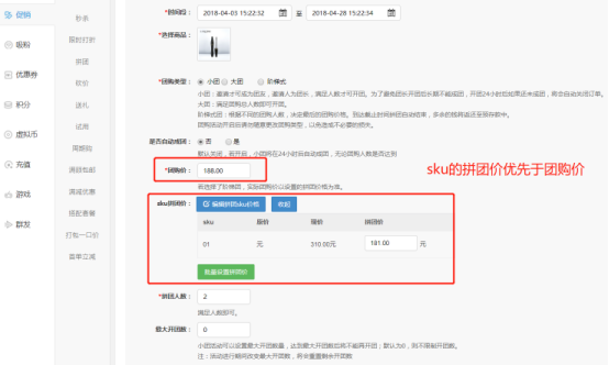 拼團活動可以對商品不同的sku設置不同的拼團價