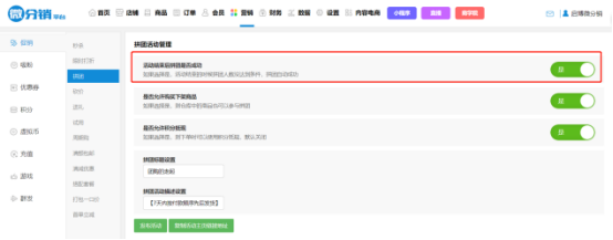 操作步驟: 總部后臺→營銷→拼團活動→拼團活動管理:列表總設置增加“是否允許積分抵現”,的自定義按鈕,默認關閉,如果選擇是,則下單購買拼團的商品時可以使用積分抵現。