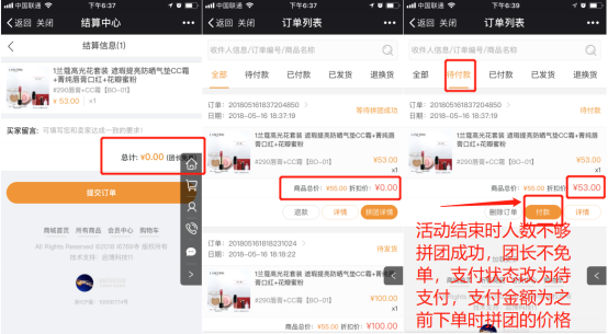 小團開啟自動成團和團長免單時,如果人數未達到的情況團長不能享受免單。比如我是團長,5人團,但我最終時間到了后只拉了2個人,那這團自動成團了,這時團長不能享受免單。若自動成團后人數不滿足,則訂單金額變為初始值,訂單狀態為未支付,用戶可進行支付操作。