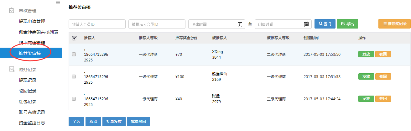 推薦獎可以設置是否需要審核,如果不需要審核,推薦獎發放后,在“財務→財務操作→代理商推薦獎/訂貨商推薦獎”發放記錄中可查詢。