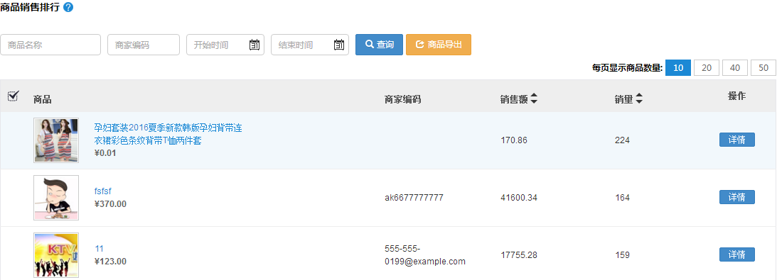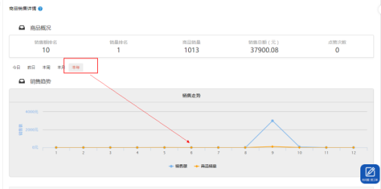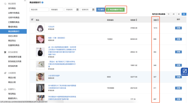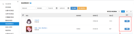進(jìn)入商品銷售排行榜列表頁,可以清楚的看到當(dāng)前的銷量排名,點(diǎn)擊“詳情”按鈕可以查看商品一段時間內(nèi)的各種銷售數(shù)據(jù)。