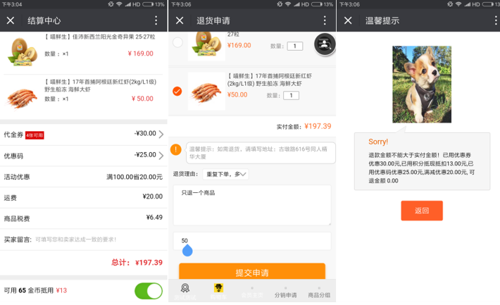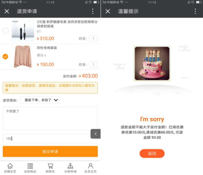 ·訂單有參與優(yōu)惠后,商品不能全額退款時(shí),提示優(yōu)惠了多少,可退多少