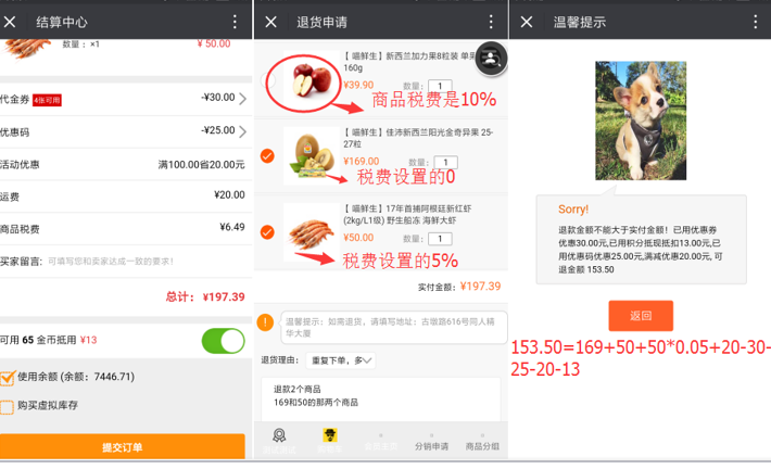 ·· 一個(gè)訂單中多個(gè)商品:只退部分商品的話(商品的價(jià)格+商品稅費(fèi)+運(yùn)費(fèi))-參與的優(yōu)惠(積分抵現(xiàn)的/優(yōu)惠券/優(yōu)惠碼/滿減)=實(shí)際退的金額。