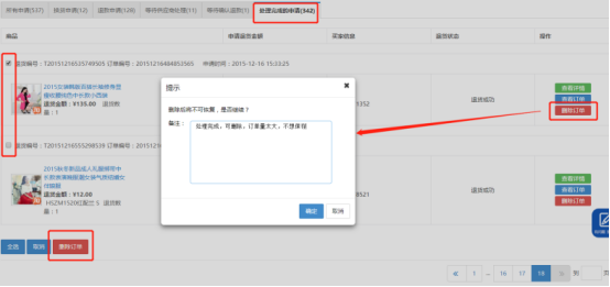 操作步驟: 總部后臺(tái)→訂單→售后服務(wù)→退換貨審核:商家可以刪除/批量刪除已經(jīng)處理完成的退換貨申請(qǐng)訂單,刪除后,后臺(tái)有日志記錄,且不可恢復(fù)。