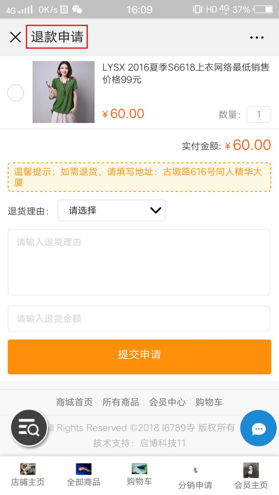 手機(jī)端購(gòu)買商品申請(qǐng)退款(商品未發(fā)貨的情況下),進(jìn)入“退款申請(qǐng)”頁面: