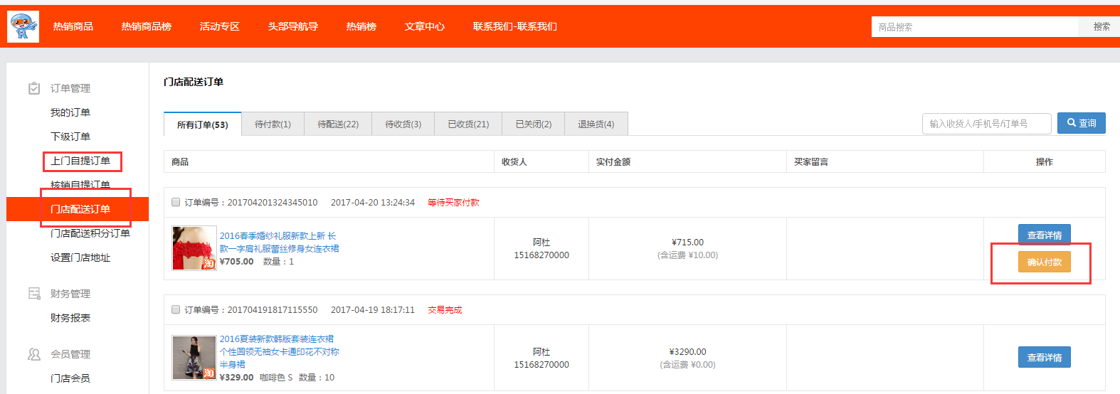 點擊“門店訂單”可以查看門店自提和配送的訂單。 【新增】對于線下付款的訂單,門店后臺可以確認付款,便于會員付款給門店的情況 。