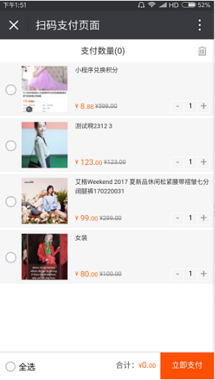 門店后臺商品增加掃描支付商品二維碼,掃描后可以選擇多個產(chǎn)品進行付款
