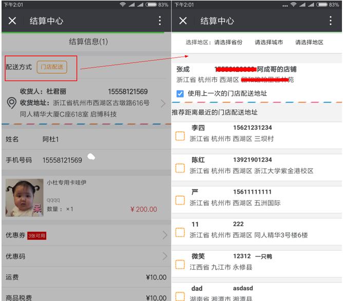 門店配送:? 當配送方式只有門店配送方式時,結(jié)算時直接跳出門店配送地址