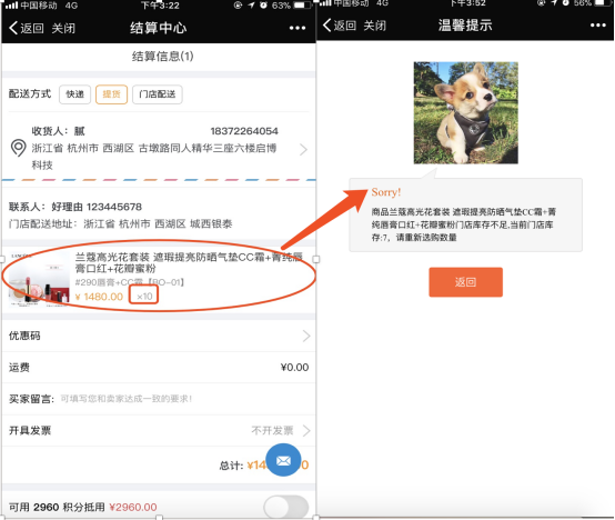 如果商品的門店庫存不足,會員則不能下單,提示門店庫存不足。