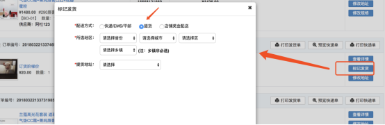 2、在訂單標記發(fā)貨、修改地址和手機端門店配送訂單選擇自提地址,顯示門店名稱。