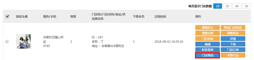 對所有門店進行相關(guān)管理,可以通過所在分組、下級人數(shù)、訂單筆數(shù)進行查詢。 操作區(qū)可對勾選的門店進行積分調(diào)整、訂單、財務報表以及門店資質(zhì)、地址等相關(guān)設(shè)置。