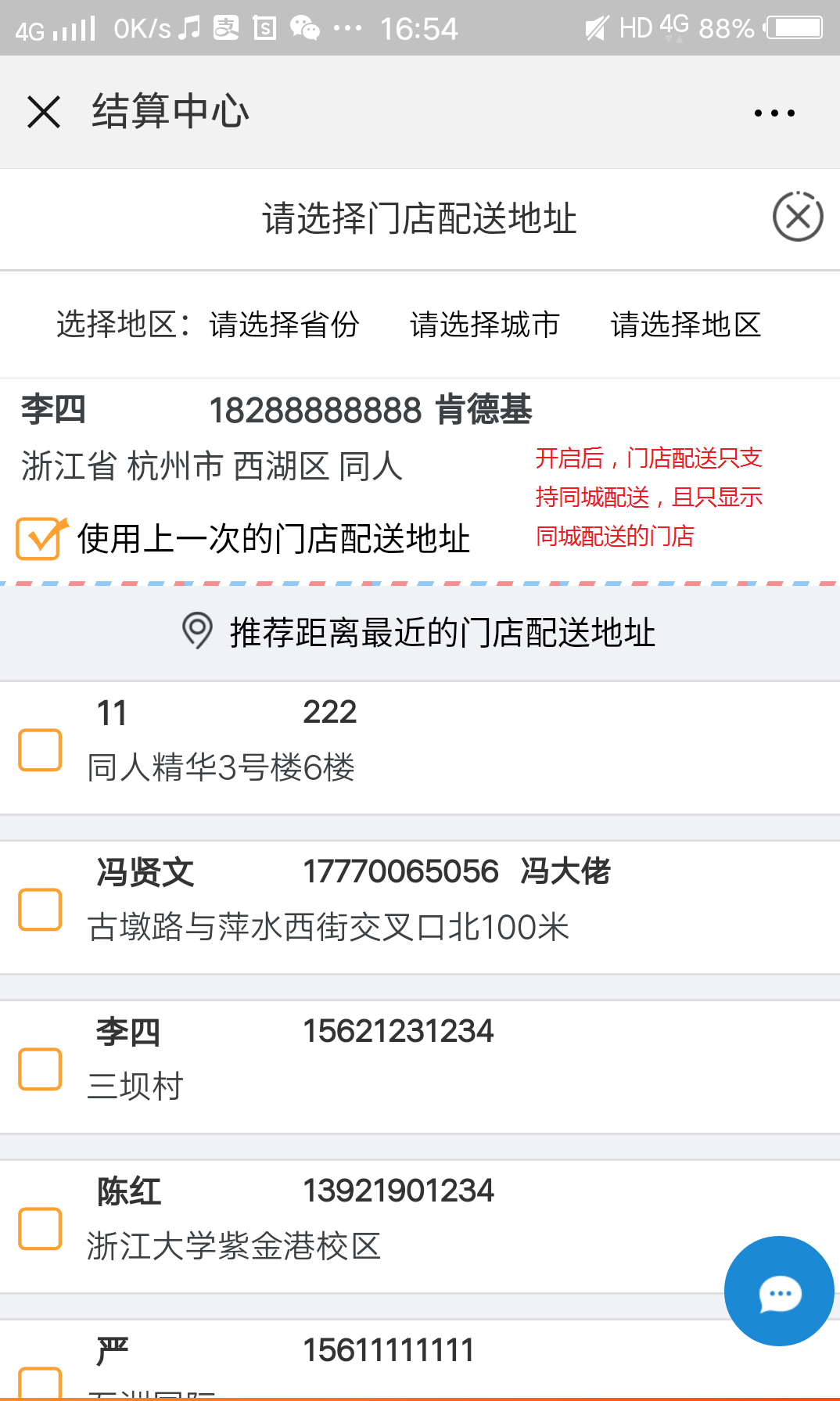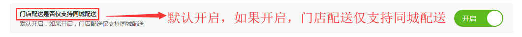 門店配送可以設(shè)置是否僅支持同城配送,開啟后會員下單選擇門店配送只顯示同個城市的門店