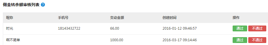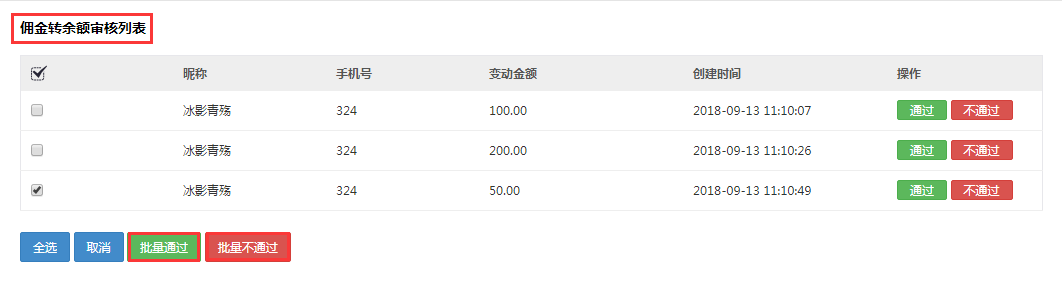 傭金轉余額申請支持批量審核,可以選擇“批量通過”或“批量不通過”