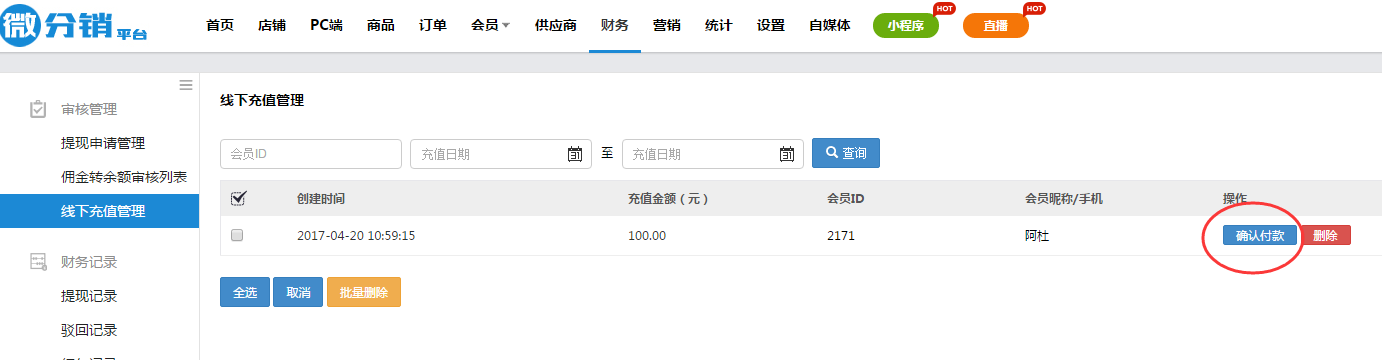 會員選擇線下充值后,后臺對該充值記錄審核,點擊確認付款后,會員的余額會自動加上充值的金額,可在會員余額變動查詢。會員微信公眾號也會收到充值通知。