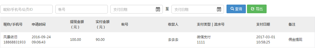 所有的發(fā)放記錄,請(qǐng)到提現(xiàn)記錄查看,可以根據(jù)昵稱、手機(jī)號(hào)碼、ID,賬號(hào),支付日期對(duì)提現(xiàn)記錄進(jìn)行導(dǎo)出。