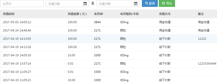 所有的賬號(hào)充值記錄,可以根據(jù)電話號(hào)碼,用戶(hù)賬號(hào),支付日期進(jìn)行查詢(xún)賬號(hào)充值記錄。
