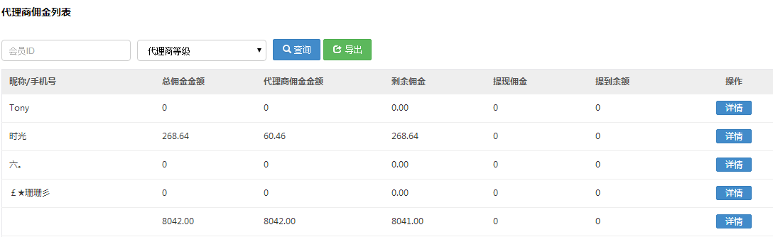 可以根據(jù)會(huì)員ID,代理商等級,對代理商傭金進(jìn)行查詢、導(dǎo)出,可以根據(jù)傭金的降序和升序進(jìn)行排序,可以點(diǎn)擊詳情查看當(dāng)前用戶的個(gè)人信息。
