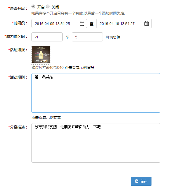 微助力活動是一種拉粉活動,所有的獎品需要線下發放。 需要設置一鍵關注,用戶可以通過公眾號發送“超級加油”獲取有效的助力活動。 點擊“發布活動”按鈕,新建新的助力活動,如下圖所示: