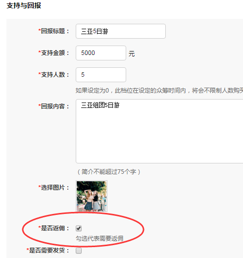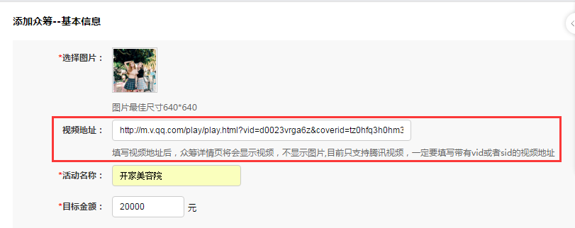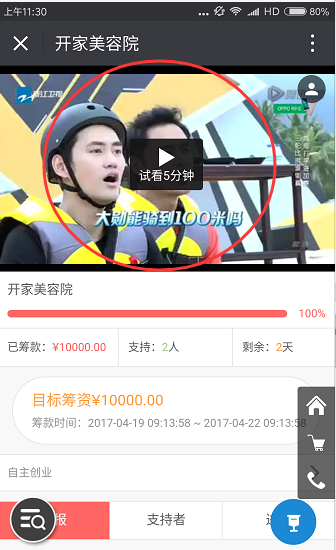 點擊【添加微眾籌】 眾籌可以設置是否返傭,活動頁面頂部可以展示視頻