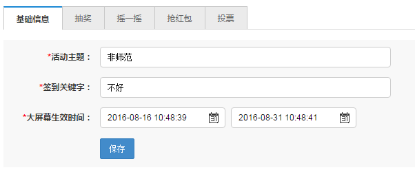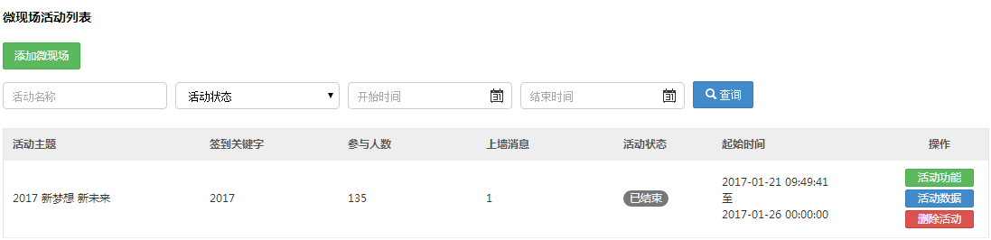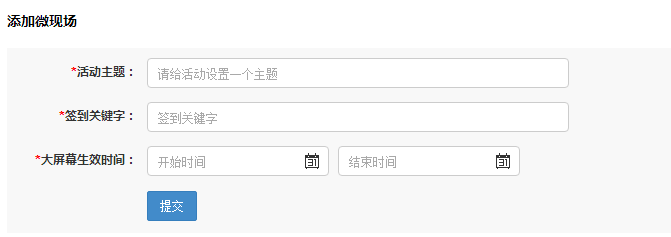 適用于線下活動現(xiàn)場,快速吸粉。 目前微分銷系統(tǒng)擁有以下活動:現(xiàn)場抽獎、搖一搖、搶紅包、投票。 活動流程:1、添加微現(xiàn)場。2、設(shè)置活動主題與關(guān)鍵字,活動開始時間。3、創(chuàng)建現(xiàn)場活動。 參與流程:1、關(guān)注公眾賬號。2、發(fā)送簽到關(guān)鍵字。3、發(fā)送參與活動關(guān)鍵字參與活動即可。 點擊【微現(xiàn)場】添加現(xiàn)場活動,如下圖所示: