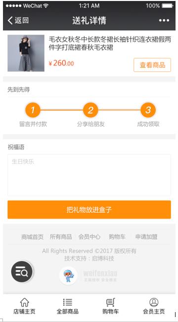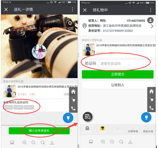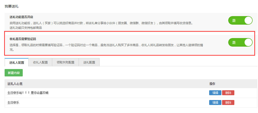開啟送禮是否需要驗證碼: 選擇是,領(lǐng)取禮品的時候需要填寫驗證碼,一個驗證碼對應(yīng)一個商品,避免當(dāng)送禮人購買了多件商品,收禮人將禮品轉(zhuǎn)發(fā)給朋友,讓其他人繼續(xù)領(lǐng)的情況。