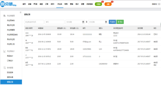 供應商提現后,不管是提現成功還是被駁回,記錄都會統計在提現記錄中,可以按照供應商名稱、手機號、賬號、支付日期來查詢記錄。商家也可以導出提現記錄。