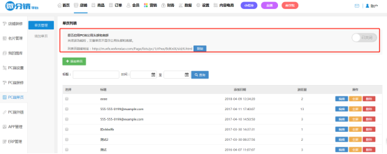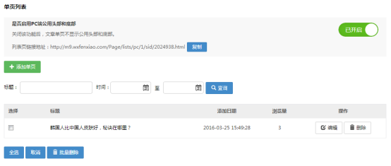 先來看一下”單頁管理“點擊”添加單頁“進行文章的添加。已有的文章可在單頁列表中進行管理。 是否啟用PC端公共頭部和底部,系統默認為”已開啟“,如需關閉,請點擊”已開啟“按鈕。”公共頭部”是指導航以上的叫頭部,“共公底部”是指版權底部信息。