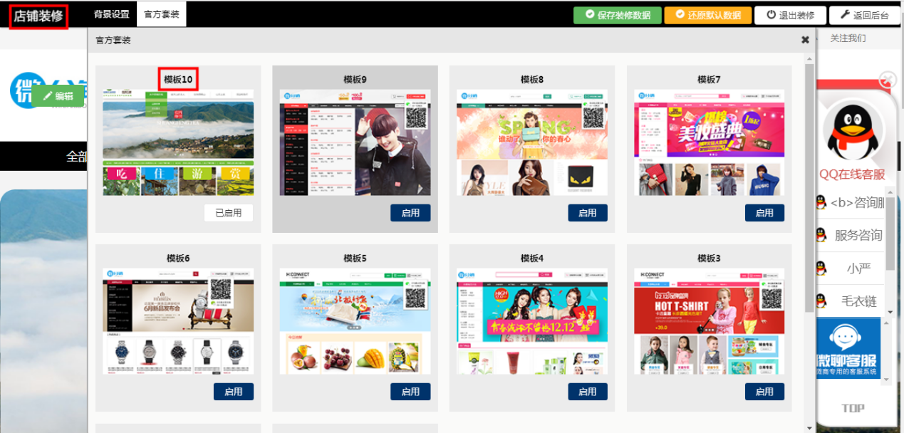 點擊“官方套裝”進入到系統默認的模板選擇頁面。用戶根據自身需求選擇,點擊“啟用”。