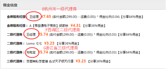 當代理模式選擇區域代理優先:D下單購買商品到浙江省杭州市西湖區,E拿杭州市一級代理傭金,F拿西湖區二級代理傭金,G拿浙江省三級代理傭金;而ABC拿非區域分享機制傭金;
