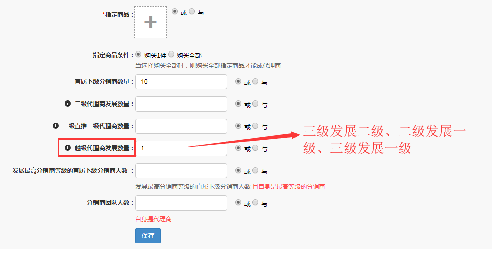 代理商自動升級條件中增加“越級代理商發展數量”(三級發展二級、二級發展一級、三級發展一級),達到相應數量,符合自動升級條件可以升級為相應代理商。