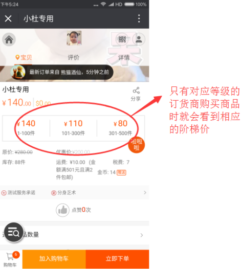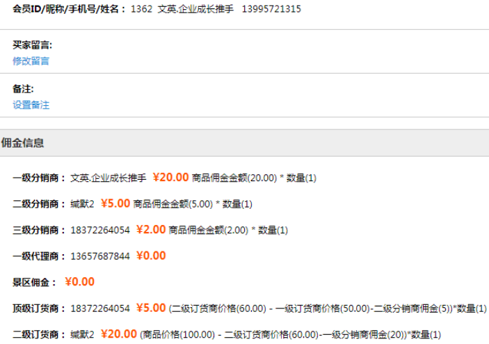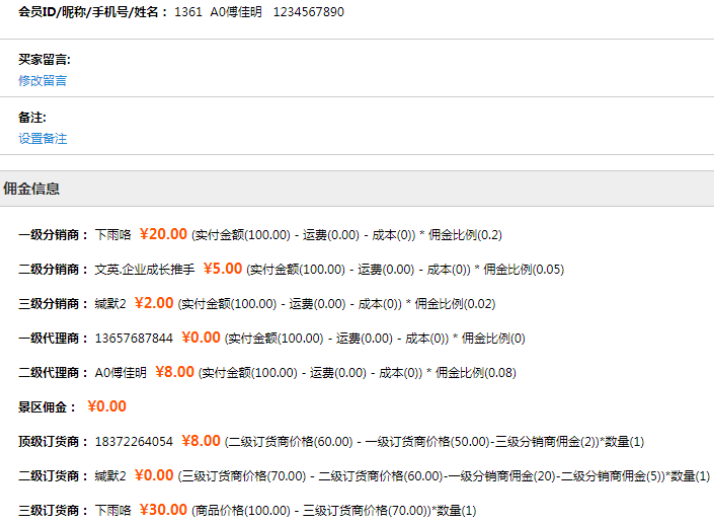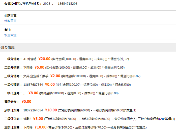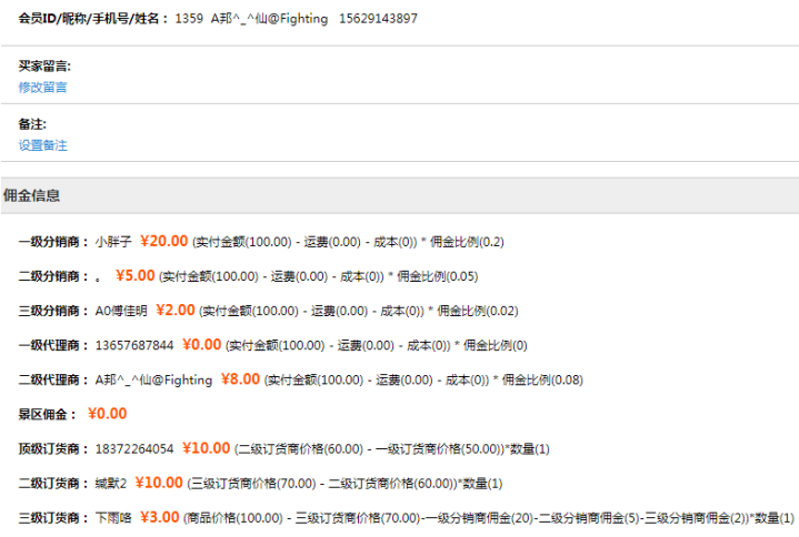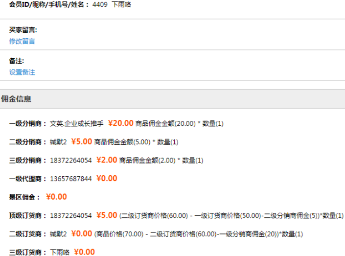 比如:一個(gè)商品設(shè)置了一級(jí)訂貨商階梯價(jià)為100元,商品總價(jià)為150,那么一級(jí)訂貨商A下面的會(huì)員購(gòu)買(mǎi)商品時(shí),A拿到的差價(jià)為150-100=50元;