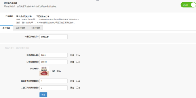 總部后臺(tái)→設(shè)置→系統(tǒng)設(shè)置→訂貨商設(shè)置:增加是否開(kāi)啟訂貨商自動(dòng)升級(jí)功能,開(kāi)啟該功能后,會(huì)員滿(mǎn)足下方條件將自動(dòng)成為相應(yīng)等級(jí)的訂貨商。