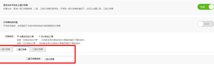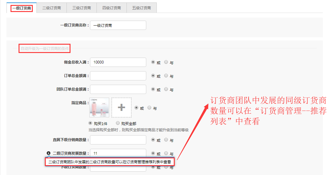 訂貨商升級(jí)條件“指定商品” 購(gòu)買(mǎi)過(guò)指定商品自動(dòng)升級(jí)為訂貨商后,取消他們的資格后,必須重新滿(mǎn)足升級(jí)條件才會(huì)自動(dòng)升級(jí),比如再次購(gòu)買(mǎi)指定商品。