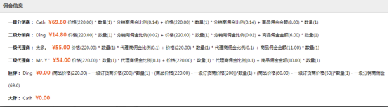 用例3:如果D實(shí)付100元下單: C拿傭金(100-70+100*20%(分銷(xiāo)商傭金)) = 50元;B1拿傭金100*5%(分銷(xiāo)商傭金)=5元;B拿傭金(70-60-20(C分銷(xiāo)商傭金)-5(B1分銷(xiāo)傭金)=0(小于0時(shí),值為0)+100*2%(分銷(xiāo)商傭金)) = 2元;A拿傭金(60-50-2(B分銷(xiāo)商傭金))= 8元;