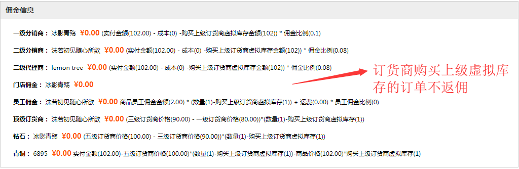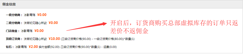 開(kāi)啟后,訂貨商購(gòu)買(mǎi)總部虛擬庫(kù)存的訂單只返訂貨商差價(jià),不返其他身份傭金: