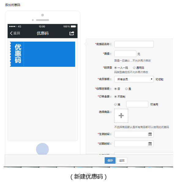 “優惠碼”功能-- 操作步驟: 總部后臺→營銷→優惠營銷:增加“優惠碼管理”,商家可以選擇是否使用優惠碼功能,開啟后商家可創建優惠碼,然后添加碼庫,再通過線下推廣的方式發給用戶。
