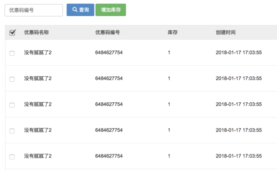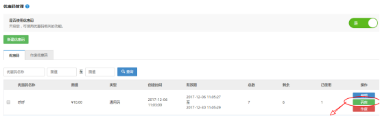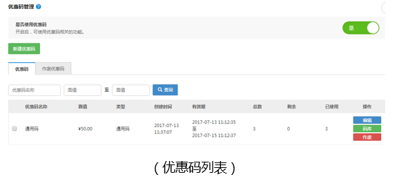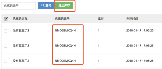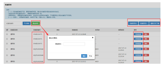 ② 點擊“碼庫”進入優惠碼庫,添加優惠碼庫存后,系統自動生成優惠碼編號和對應的鏈接