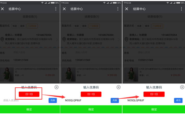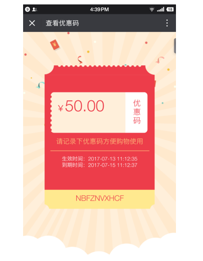 ⑤ 優惠碼的應用場景--? 商家主要是通過線下的方式來推廣優惠碼。 比如:把優惠碼做到卡片上,或者把優惠碼鏈接通過轉碼器轉換成二維碼,或者把鏈接直接發給別人。 下圖是通過鏈接打開的優惠碼: