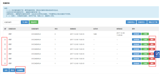 操作步驟: 總部后臺→營銷→優惠營銷→優惠碼管理:點擊優惠碼的“碼庫”進入對應的“優惠碼庫”,可以批量刪除未使用的優惠碼,也可以針對某個優惠碼單個刪除,已經被使用的優惠碼不能被刪除。