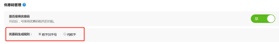 操作步驟: 總部后臺→營銷活動→優惠碼管理:新增優惠碼生成規則:“數字加字母”或“純數字”,默認是生成“數字加字母”。