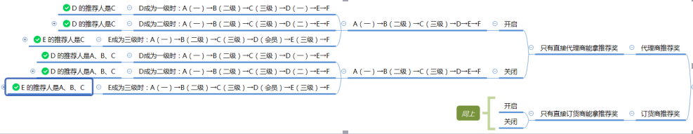 ? 總部后臺→會員→訂貨商:訂貨商推薦獎,增加“只有直接訂貨商能拿推薦獎”的開關,開啟后,只有直接訂貨商能拿推薦獎,間接訂貨商拿不到推薦獎。 關系:A→B->C->D,A是一級訂貨商商,B是二級訂貨商,C是三級訂貨商 D是會員 當D成為訂貨商之后,只有C(直接訂貨商)能拿推薦獎,A,B拿不到推薦獎。