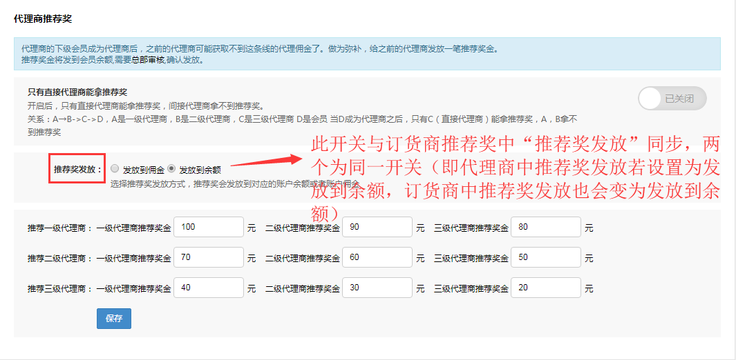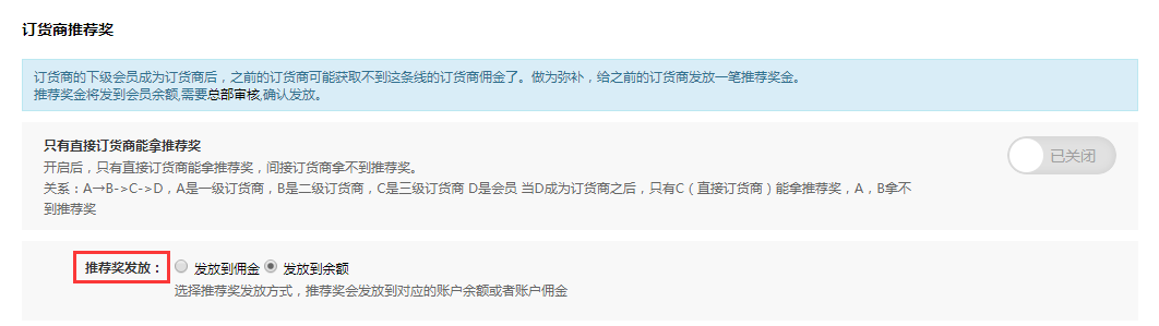 推薦獎可以設置發到余額或發到傭金