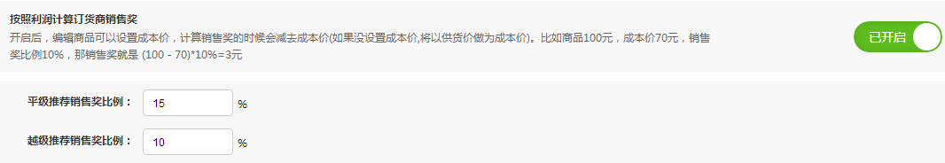 總部后臺→會員→訂貨商→訂貨商管理:訂貨商銷售獎增加“按照利潤計算訂貨商銷售獎”的開關,開啟后,編輯商品可以設置成本價,計算銷售獎的時候會減去成本價(如果沒設置成本價,將以供貨價做為成本價)。比如商品100元,成本價70元,銷售獎比例10%,那銷售獎就是 (100-70)*10%=3元。