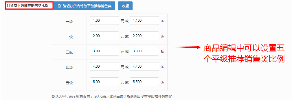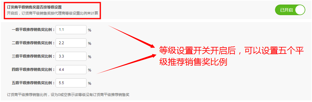 訂貨商平級推薦銷售獎可以根據需求設置五個等級平級推薦銷售獎比例,規則與代理商平級推薦銷售獎相同。